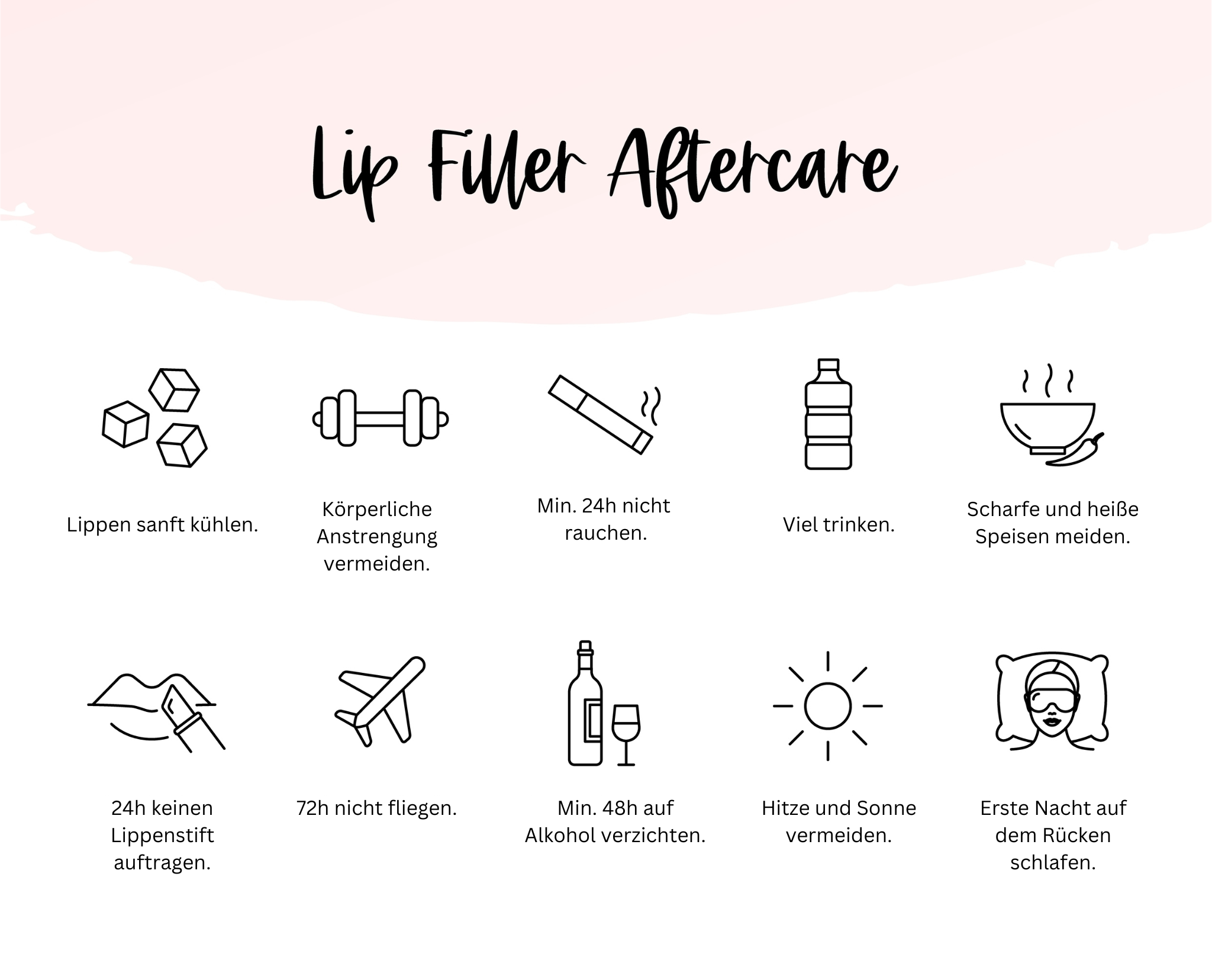 Die Nachsorge ist entscheidend für ein optimales Ergebnis. Direkt im Anschluss an die Lippenunterspritzung solltest du deine die Lippen zu kühlen. Dadurch reduzierst du Schwellungen oder Rötungen. Es ist wichtig, in den ersten 24 bis 48 Stunden körperliche Anstrengung, intensive Hitze durch Sauna oder Solarium sowie Druck auf die Lippen zu vermeiden. Wir raten dir auch mindestens 24h auf Alkohol und Tabak zu verzichten. Idealerweise schläfst du die erste Nacht vorwiegend auf dem Rücken. Diese Maßnahmen helfen dir, das Ergebnis zu stabilisieren und das Risiko von Komplikationen zu minimieren. Einige Tage nach der Lippenunterspritzung kannst du bei Bedarf einen Kontrolltermin vereinbaren. So kann die Ärztin/der Arzt das Ergebnis überprüfen und gegebenenfalls kleine Anpassungen vornehmen.